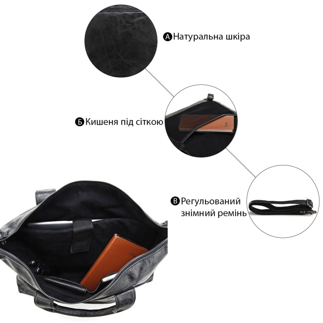 Классическая горизонтальная сумка черного цвета. Суму можно носить как с помощью плечевого ремня так и в руках.