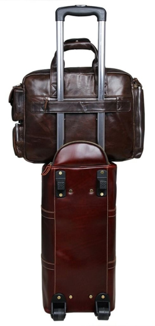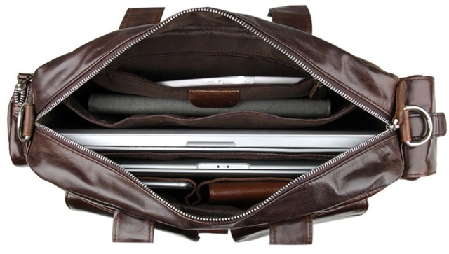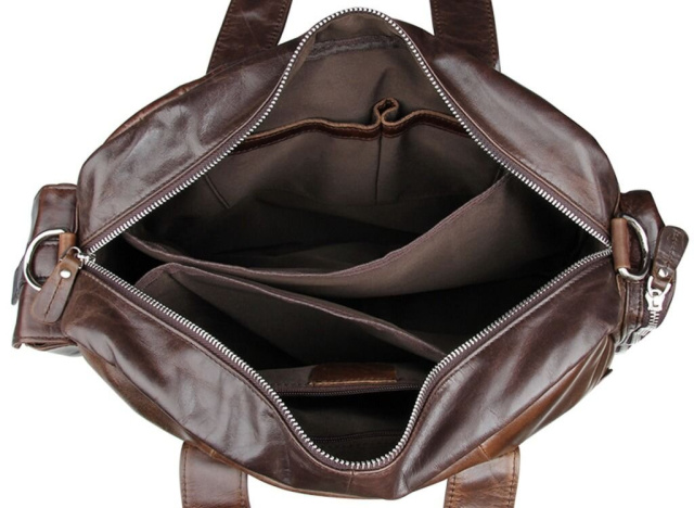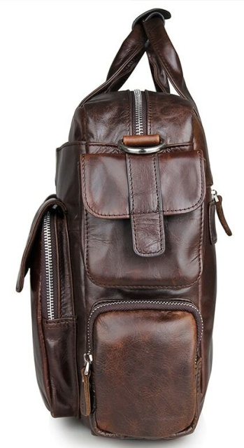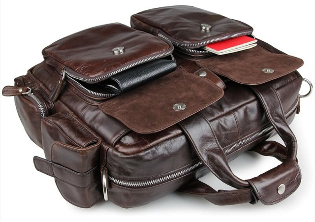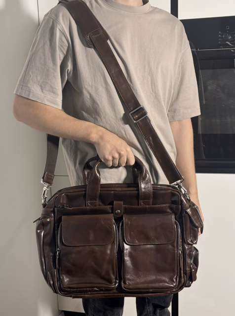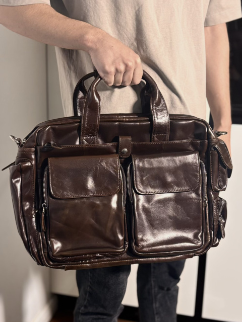 Многофункциональная мужская кожаная сумка коричневого цвета. Цвет фурнитуры: серебро. На лицевой стороне расположены два накладных кармана на молнии под клапанами, а также один большой карман, который закрывается кожаным хлястиком на кнопке. На задней внешней стороне изделия находится отделение на молнии. Сумку можно носить в руке при помощи удобных кожаных ручек, а также через плечо (в комплекте съемный, регулируемый плечевой ремень). На боковых гранях изделия находятся накладные карманы. Аксессуар упакован в текстильный пылезащитный чехол белого цвета.