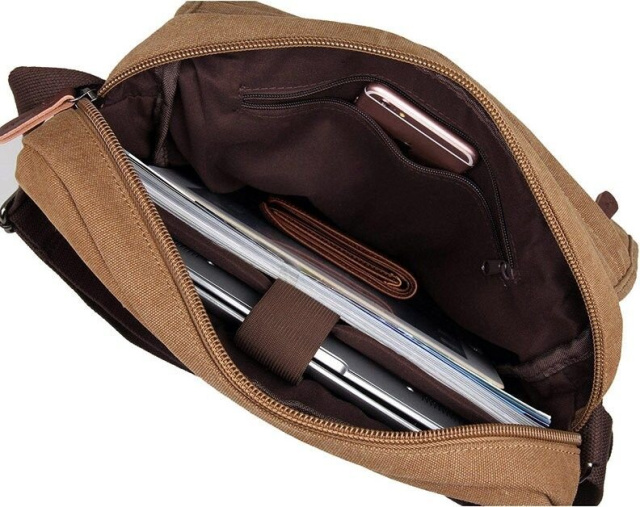 Модель имеет одно большое основное отделение на молнии. Внутри предусмотрены потайной карман на молнии и отделение для небольшого ноутбука, что делает сумку особенно удобной для работы и учебы. Под клапаном на передней части расположен большой карман на молнии, также есть небольшой карман на передней стороне клапана и карман на молнии на задней внешней стороне.