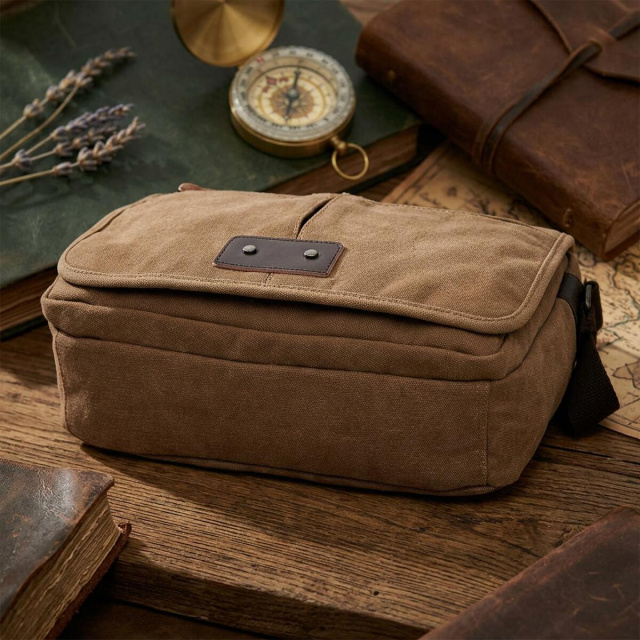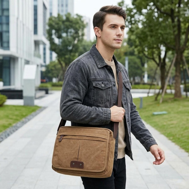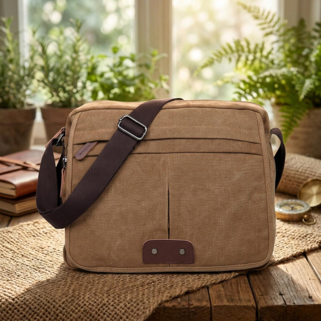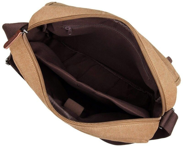 Изделие выполнено из прочного текстиля в светло-коричневом цвете. Материал хорошо подходит для активного повседневного использования, а универсальный оттенок делает модель удачным выбором для городского, повседневного и делового стиля. Сумка носится через плечо при помощи регулируемого ремня.