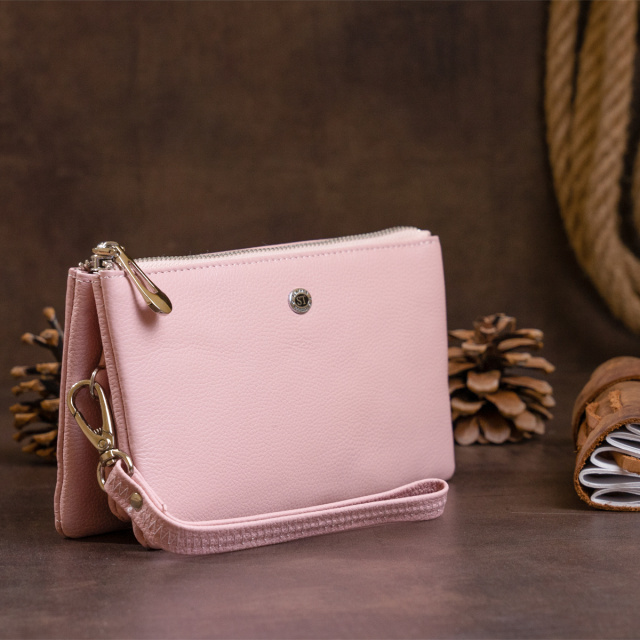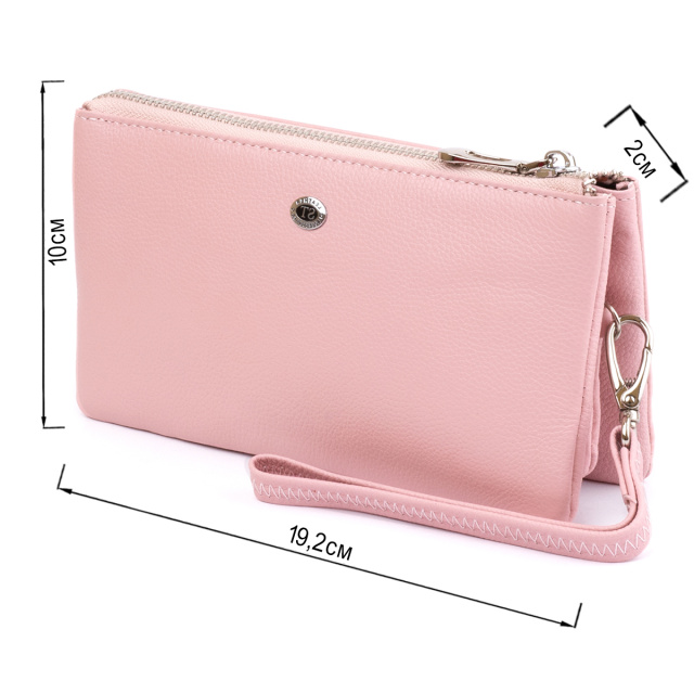 Элегантный женский клатч из натуральной кожи. Модель придает легкости и нежности вашему образу. Изделие имеет два вместительных кармана на молнии и кармашек перегородку на молнии. Модель достаточно универсальна и вместит даже мобильный телефон и паспорт. На ощупь мягкая и приятная. Имеет слабо выраженный запах натуральной кожи. Внутренняя отделка - текстиль и натуральная кожа. Клатч не займет много места в вашей сумочке или вы также можете носить его на запястье. Изделие упаковано в фирменную коробку с логотипом белого цвета.