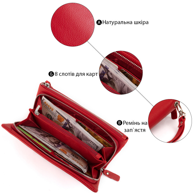 Яркий красный кошелек-клатч из новой коллекции. Новый кошелек принесет вам только положительные эмоции. Красный - выбор девушек, которые любят яркие аксессуары. Кошелек - незаменимая вещь для современной девушки. Клатч очень вместительный, ведь в нем есть даже отделение для мобильного телефона. Изделие выполнено исключительно из натуральной кожи с ее природной текстурой и легким запахом. Внутри - аксессуар из плотного текстиля. Внутренние карманы просторные и вы с удобством разложите купюры, карты, монеты и другие личные мелочи в полном порядке. В клатче вы также найдете карман для мобильного телефона или паспорта. Ни одна девушка не устоит перед нашей новинкой. Заказывайте у нас по самым доступным ценам. Кошелек прослужит вам долгое время.