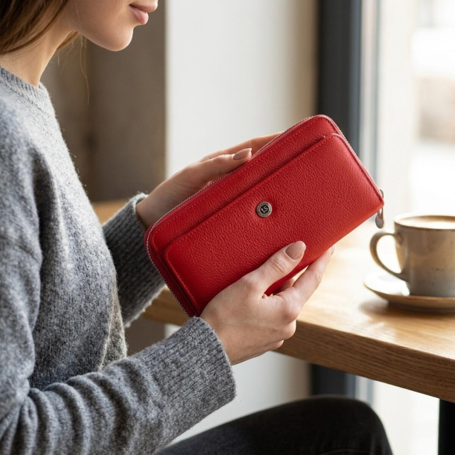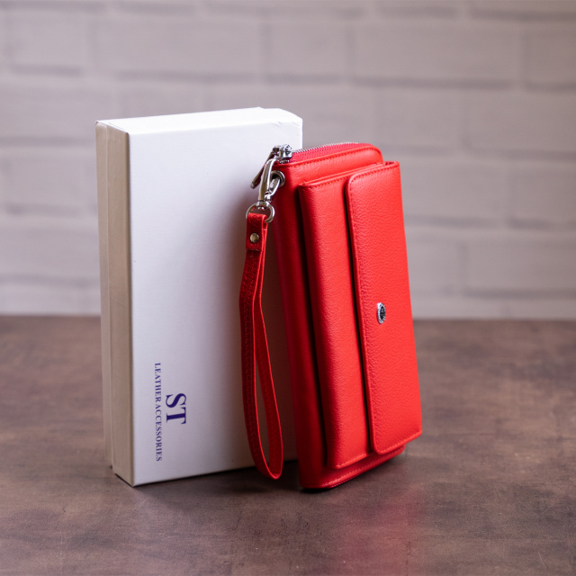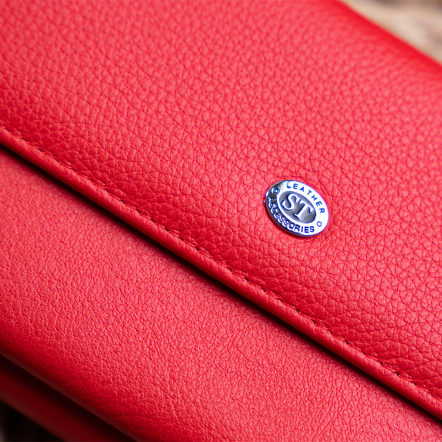 Изделие выполнено из натуральной кожи в насыщенном красном цвете. Материал приятный на ощупь, а сам аксессуар выглядит заметно и стильно, поэтому такой клатч может хорошо дополнить как повседневный образ, так и более нарядный вариант.