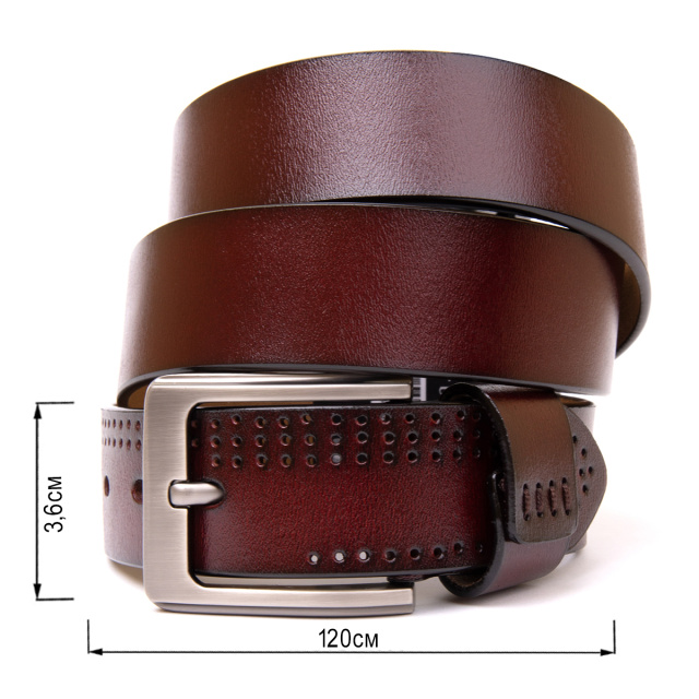 Стильный ремень в плотной коже и насыщенном коричневом цвете. Дизайн ремешка дополнен мелкими дырками по всей длине. Аксессуар с классической массивной пряжкой из плотного металла светло-серебристого цвета. Изделие прекрасно подчеркнет ваш образ. Подойдет под любой стиль. Качественный ремень - базовая часть гардероба любого мужчины. Производство - фабричный Китай высокого качества.