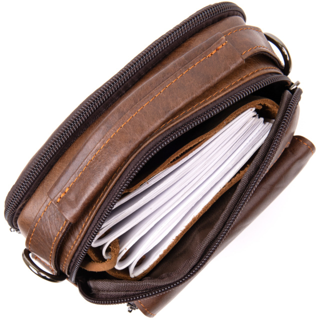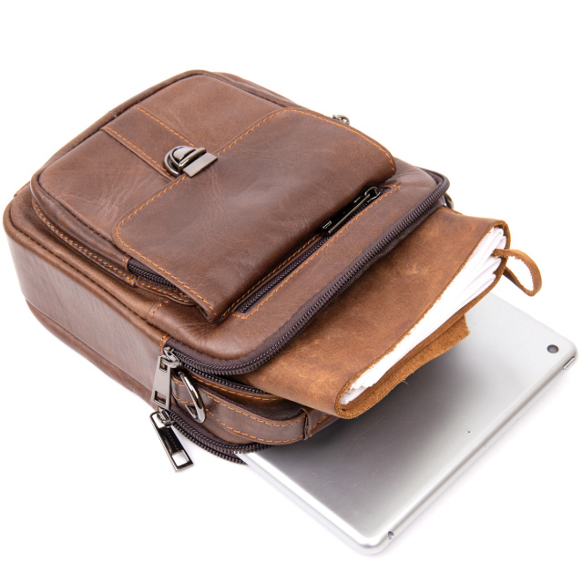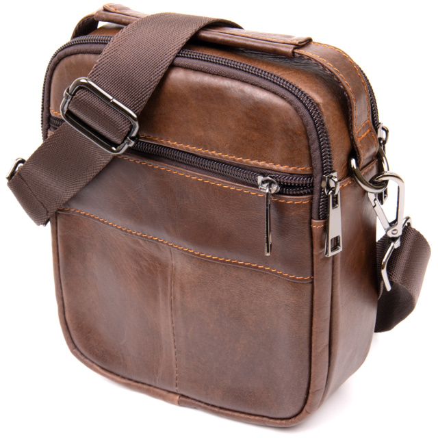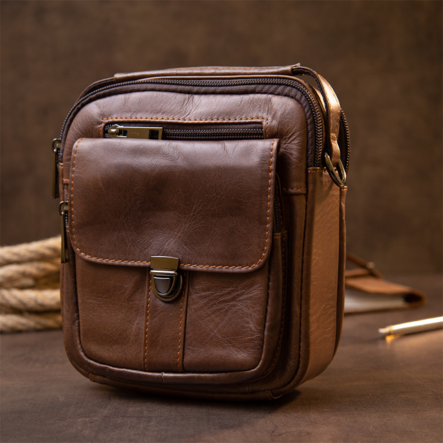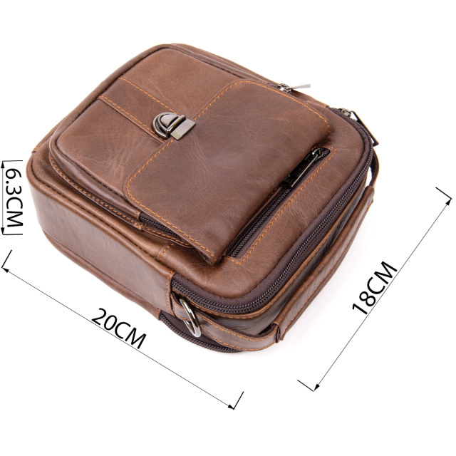 Компактная сумка в плотной коже гладкого типа насыщенного коричневого цвета. Изделие имеет очень практичный функционал несмотря на свой компактный размер. В сумку можно поместить ваши личные вещи (мобильный, кошелек, документы, кредитницу, повербанк, ключи и многое другое). Месенджер дополнен качественной фурнитурой. Производство - фабричный Китай высокого качества. В комплекте к сумке - пылезащитный чехол. Сумка - идеальный вариант как для себя так и на подарок.
