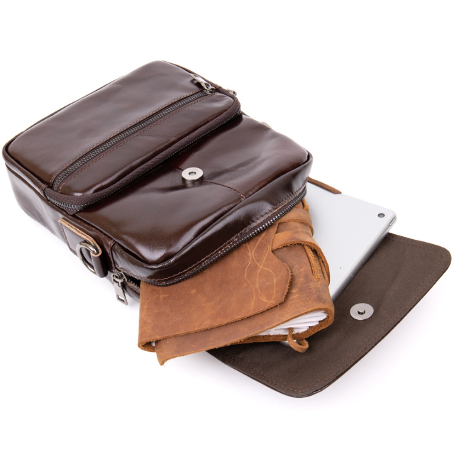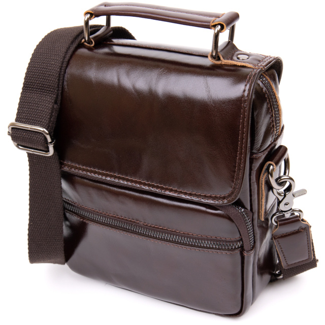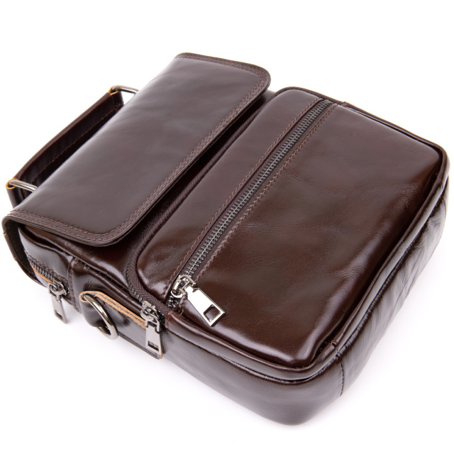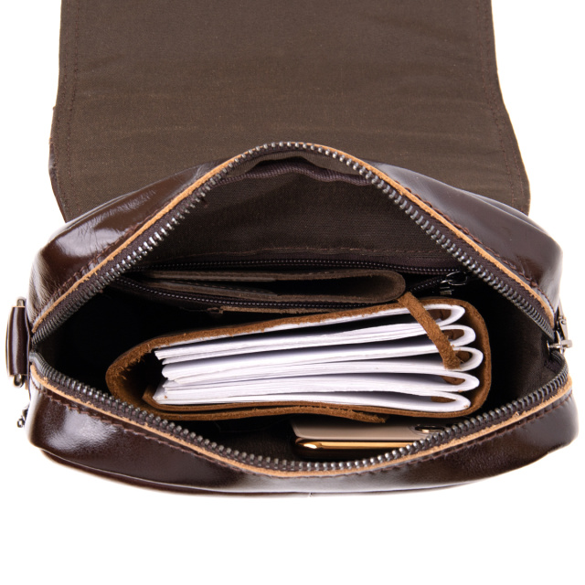 Повседневная сумка мессенджер для мужчин. Изделие идеального размера. Сумка из качественной натуральной телячьей кожи. Красиво блестит на солнце и передает красноватый оттенок. Поверхность кожи глянцевая и хорошо держит форму. Сумка имеет достаточно отделений и кармашков для удобства в использовании.