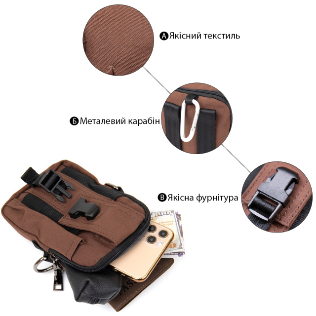 Маленькая сумка на ремень, которая заменит вам барсетку. Сумка из нейлона очень легкая и практичная. Изделие имеет необходимый функционал. Сумку можно подцепить на лямки ремня с помощью карабина. Маленькая текстильная сумка - идеальный вариант на лето. Аксессуар дополнен качественной фурнитурой и имеет бюджетную стоимость. Сумочка будет идеальным подарком для ваших близких.