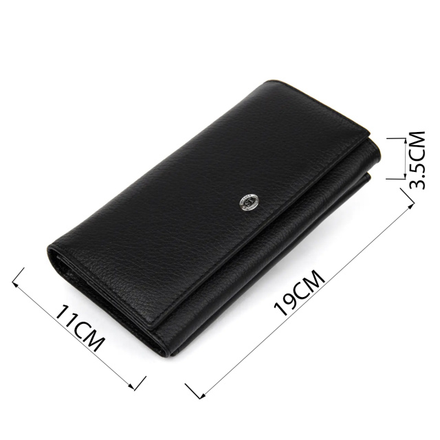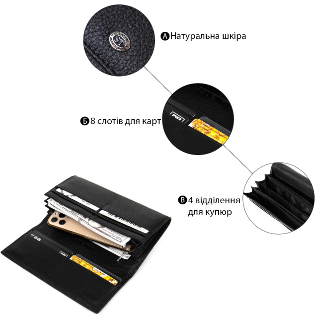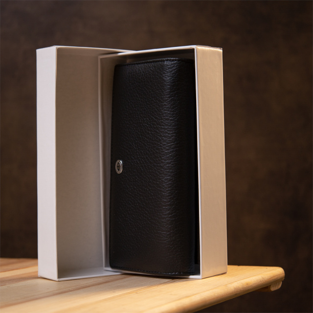 Материал: натуральная кожа. Цвет: черный. Размеры (ШхВхГ, см): 19х11х3,5 см. Страна производитель: Китай. Бренд: ST Leather. Описание: - основное отделение закрывается на два магнита; - внутри расположено четыри больших отделения для купюр по всей длине; - одно отделение на всю длину для прочих ценных вещей; - 2 отделения на молниях; - 8 карманов для карточек; - монетница на двух магнитах на внешней стороне; Вместительный кошелек из натуральной мягкой кожи в универсальном черном цвета. Имеет хорошо продуманный дизайн, что очень важно в современном мире. Все свои ценные вещи можно поместить в этот функциональный кошелек, благодаря множеству отделений и карманов. Также интересным моментом является внешняя монетница на двух магнитах,что смотрится необычно, но очень практично.