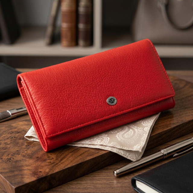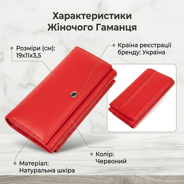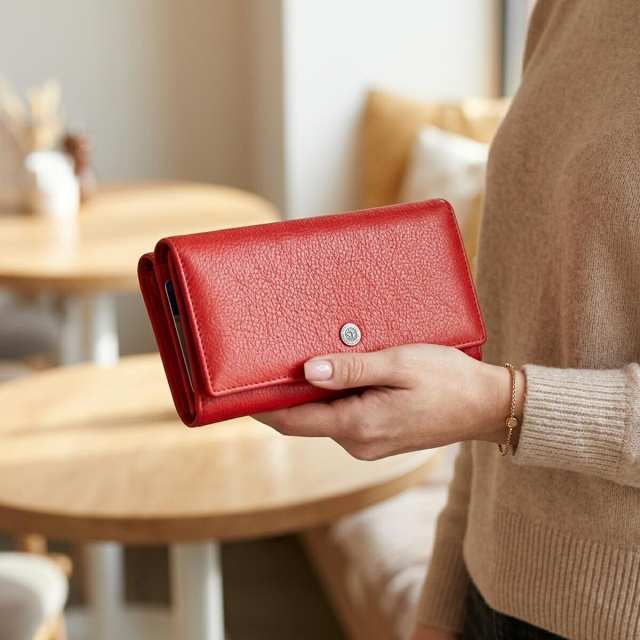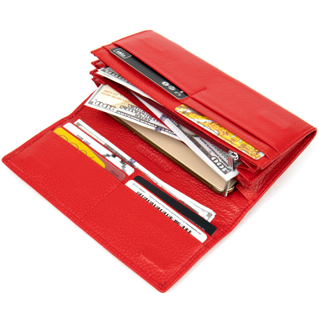 Изделие выполнено из натуральной кожи в насыщенном красном цвете. Материал приятный на ощупь, выглядит эффектно и хорошо подходит для ежедневного использования. Классический формат делает модель удобным выбором для женщин, которые ценят аккуратные и функциональные аксессуары.