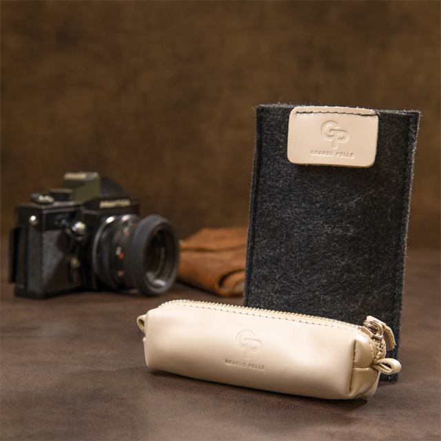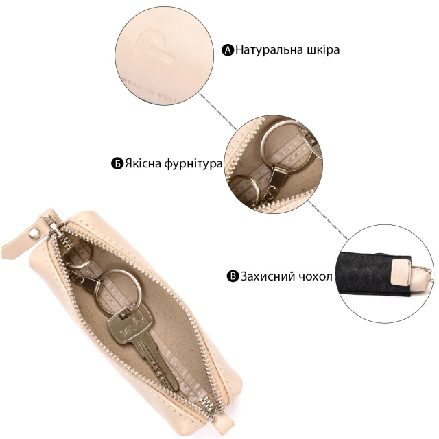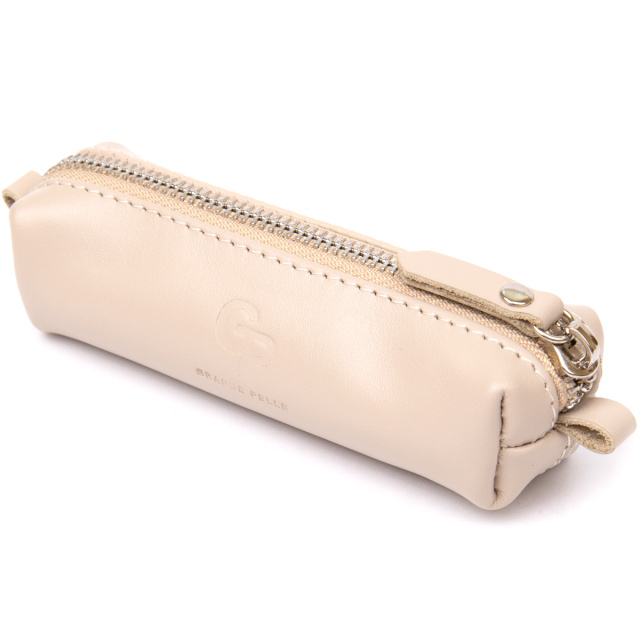 Оригинальная ключница в форме тубуса из натуральной качественной кожи от украинского производителя. Имеет красивый бежевый цвет и серебреную фурнитуру. Несомненно, станет отличной защитой содержимого Вашей сумки от царапин, которые могут причинить ключи. Упаковано изделие в оригинальный чехол.