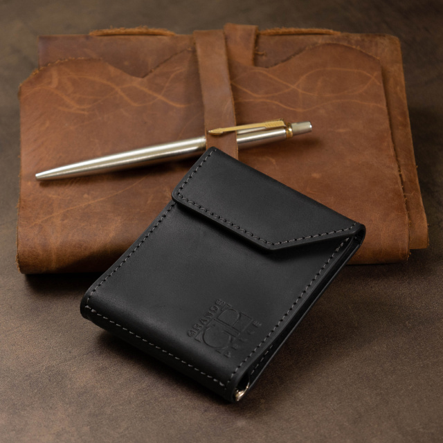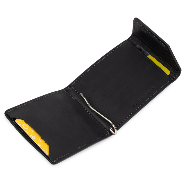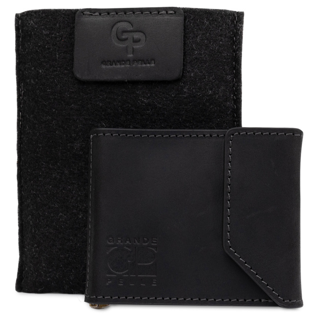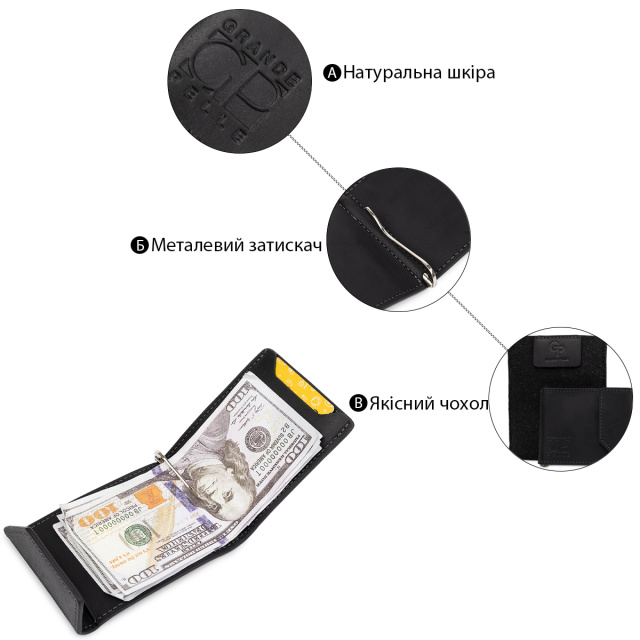 Компактный мужской зажим для денег для тех, кто не любит большие громоздкие кошельки. Имеет красивую матовую фактуру и универсальный черный цвет. Внутри кроме металлического зажима присутствуют два вместительных кармана для карт. Выполнено изделия из натуральной высококлассной кожи.