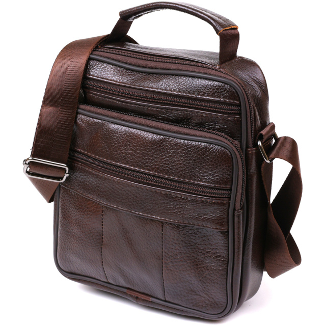 Отличная небольшая мужская сумка из высококлассной натуральной кожи с приятной на ощупь зернистой фактурой. Имеет вместительное основное отделение и практичные дополнительные карманы на внешней стороне для быстрого доступа к содержимому. Данная модель выполнена в насыщенном коричневом цвете и смотрится очень презентабельно. Ее можно носить как на плече, так и в руках.