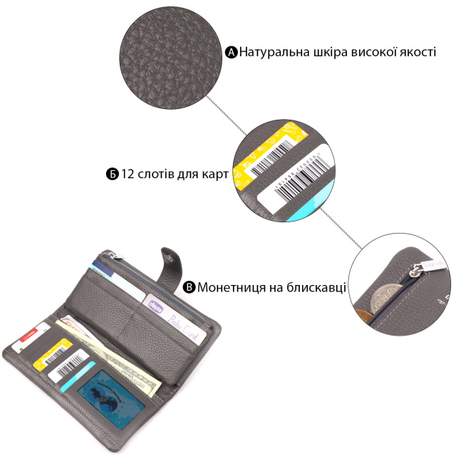 Вертикальный женский кошелек из натуральной зернистой кожи, в красивом сером цвете. Внутренний разворот состоит из четырех открытых отделений для купюр, одного кармана с расширителем на застежке, одного скрытого кармана на молнии, одного кармана-перегородки на молнии, одного сетчатого карманчика и двенадцати секций для пластиковых карт. Складывается аксессуар пополам, с фиксацией на хлястик с магнитом. Такой кошелек из натуральной кожи - это идеальный вариант на каждый день для тех, кто ценит качество, удобство и комфорт.