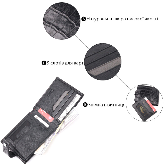 Классический мужской кошелек из натуральной кожи, в классическом черном цвете. Портмоне пошито из комбинации двух видов кожи: фактурной кожи под крокодила - снаружи и зернистой кожи - внутри. С наружной стороны находится карман с блоком под карточки и документы. Закрывается кошелек хлястиком с кнопкой. Обладает стандартным горизонтальным форматом, помещается в карман. Изделия из натуральной кожи всегда будут отличным подарком для близкого человека.