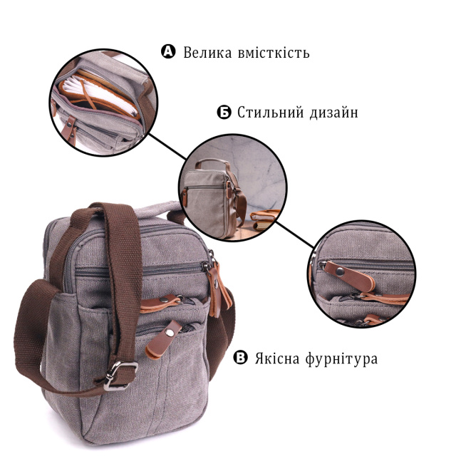 UA MarketКиївJANAВсе товарыТовари та послугиСумки мужскиеМужские сумкиКожаные мужские сумкиКомпактная мужская сумка из плотного текстиля 21244 Vintage Серая