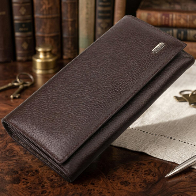 Изделие выполнено из натуральной кожи коричневого цвета. Материал выглядит стильно, приятен на ощупь и хорошо подходит для ежедневного использования. Горизонтальный формат делает модель удобной для тех, кто ценит вместительность и порядок в вещах.