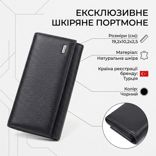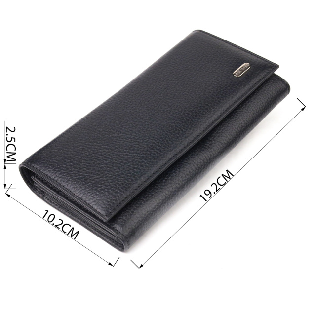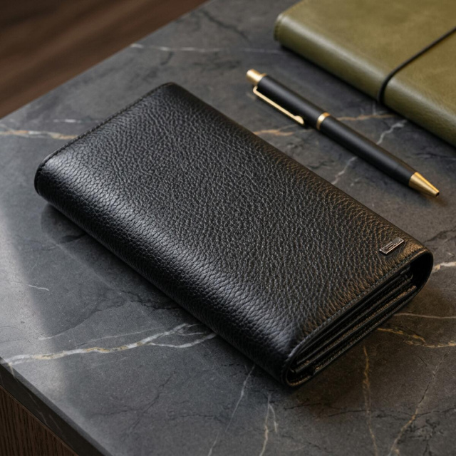 Изделие выполнено из натуральной зернистой кожи черного цвета. Материал приятный на ощупь, выглядит стильно и хорошо подходит для ежедневного использования. Горизонтальный формат делает модель удобной для тех, кто ценит вместительность и порядок в вещах.