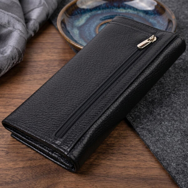 Изделие выполнено из натуральной зернистой кожи черного цвета. Материал приятный на ощупь, выглядит стильно и хорошо подходит для ежедневного использования. Горизонтальный формат делает модель удобной для тех, кто ценит вместительность и порядок в вещах.