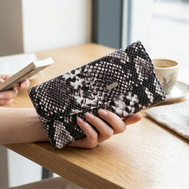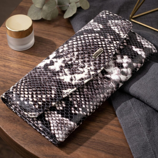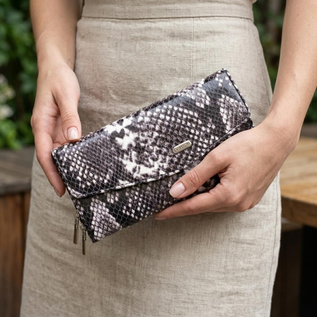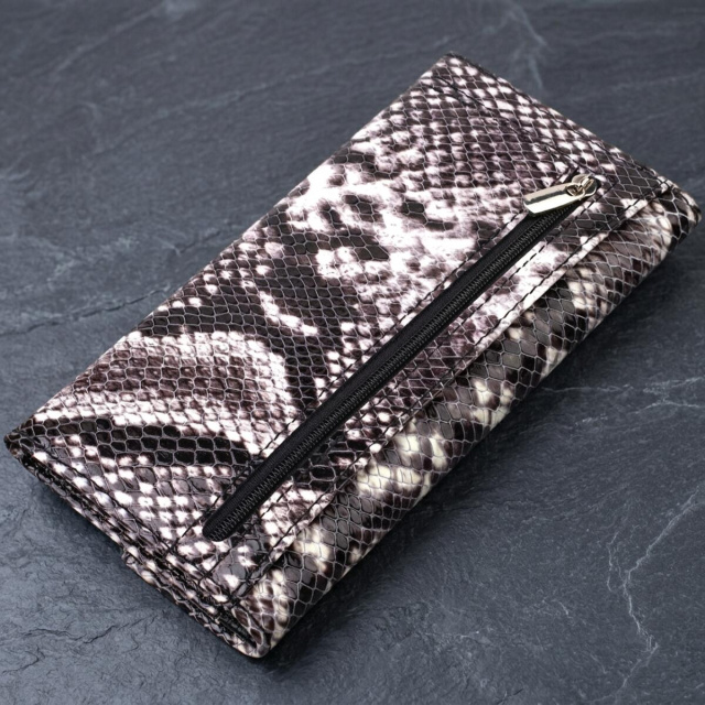 Особенности: горизонтальный формат, вместительная конструкция, тиснение под змею, монетница, застежка на кнопку.