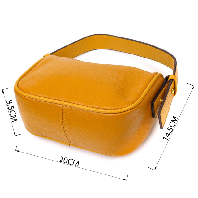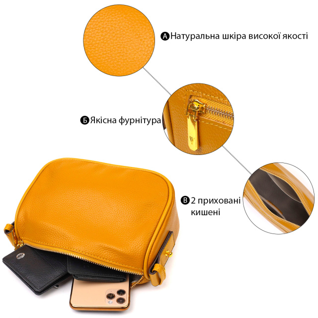 Яркая сумка из натуральной мягкой кожи высокого качества. Изделие очень удобное, можно носить на плече и в руках. Модель дополнена фурнитурой в цвете желтого золота. Аксессуар имеет одно основное отделение на молнии в котором два кармашки - один на молнии и один открытого типа, а также карман на молнии снаружи, на тыльной стороне. Закрывается модель на молнию.