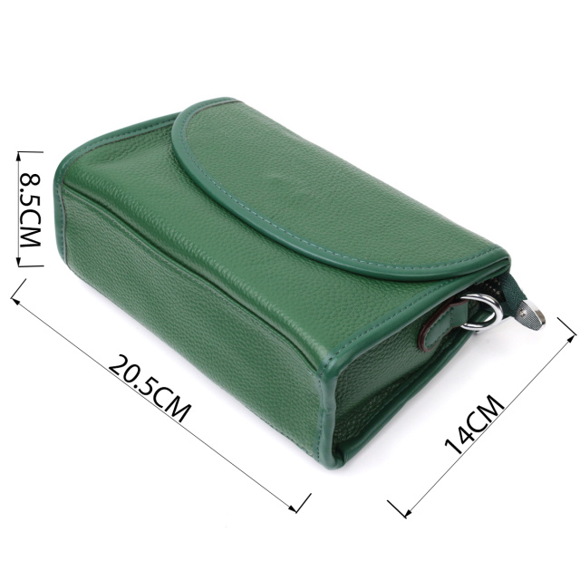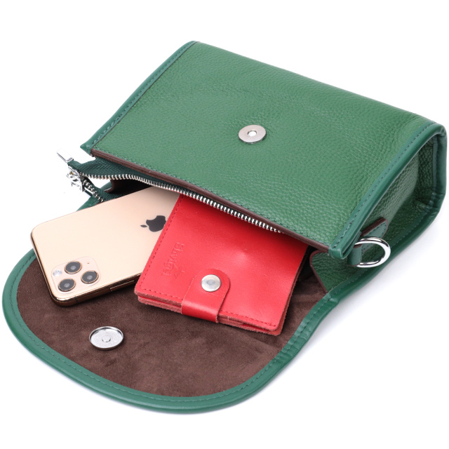 Небольшая сумочка в зеленом стильном цвете которая закрывается на молнию и стильный полукруглый клапан на магните. Изделие пошито из качественной натуральной мягкой кожи, которая долго носится и не теряет свой первоначальный вид. Аксессуар состоит из основного отделения и потайного кармана на молнии. Носить сумку можно под рукой, на плече и через плечо, для этого имеется кожаный съемный регулируемый ремень. В изделии использована качественная фурнитура серебряного цвета. Универсальный вариант сумки который подойдет для вечера, а также отлично подойдет на каждый день.