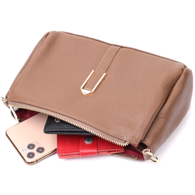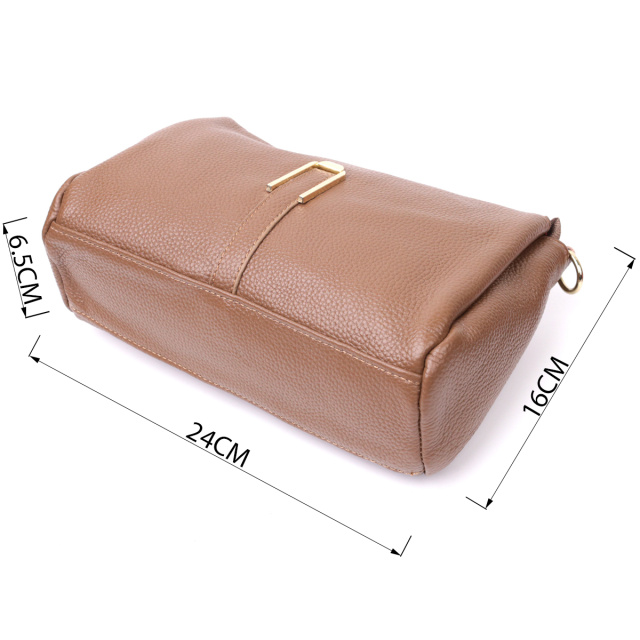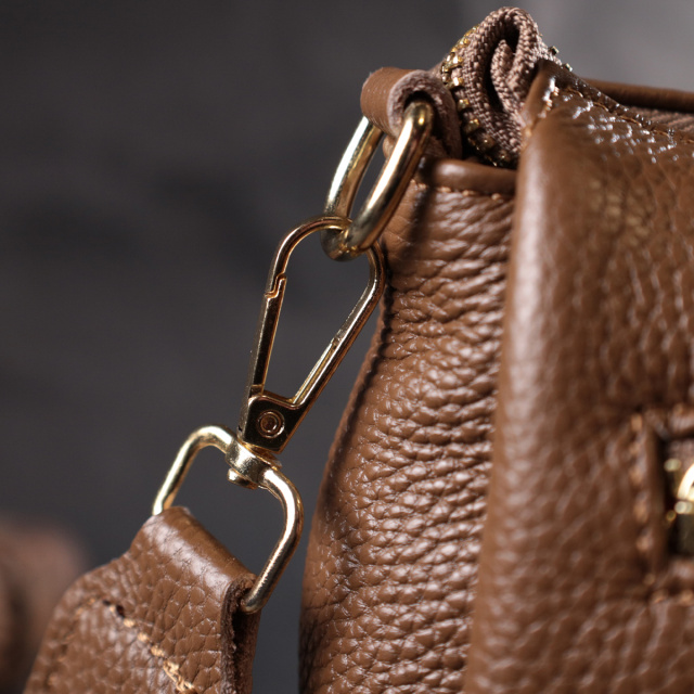 Женская сумка с красивым металлическим украшением посредине. Изделие пошито из натуральной кожи с высоким показателем качества и износостойкости. Аксессуар состоит из трех основных отделений, потайного кармана на молнии, кармана открытого типа и кармана на молнии снаружи. Носить сумку можно под рукой, на плече и через плечо, для этого имеется текстильный съемный ремень. В изделии использована качественная фурнитура цвета желтого золота. Универсальный вариант сумки как на вечер так и в качестве сумочки на каждый день.