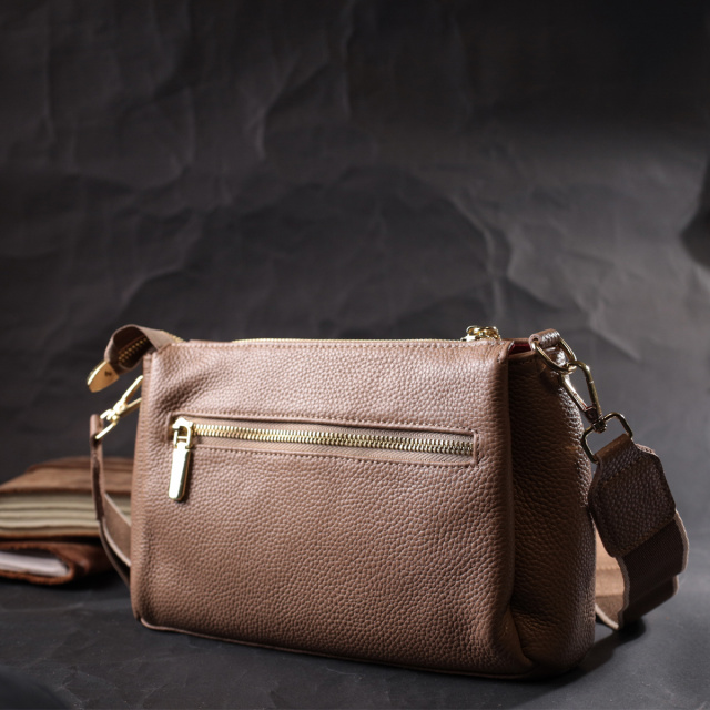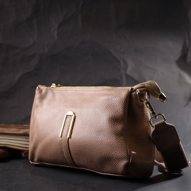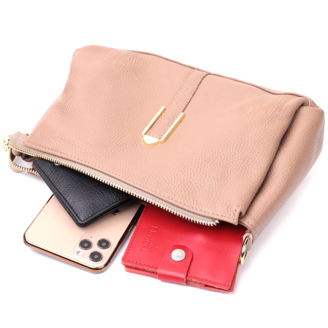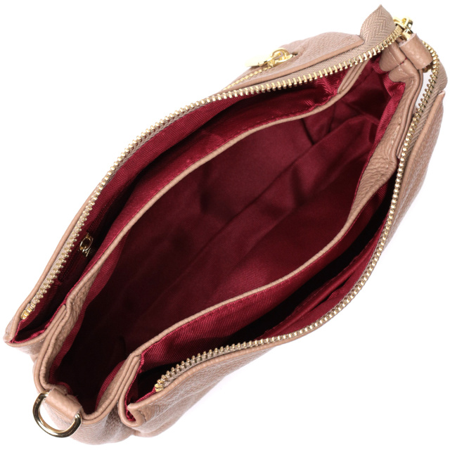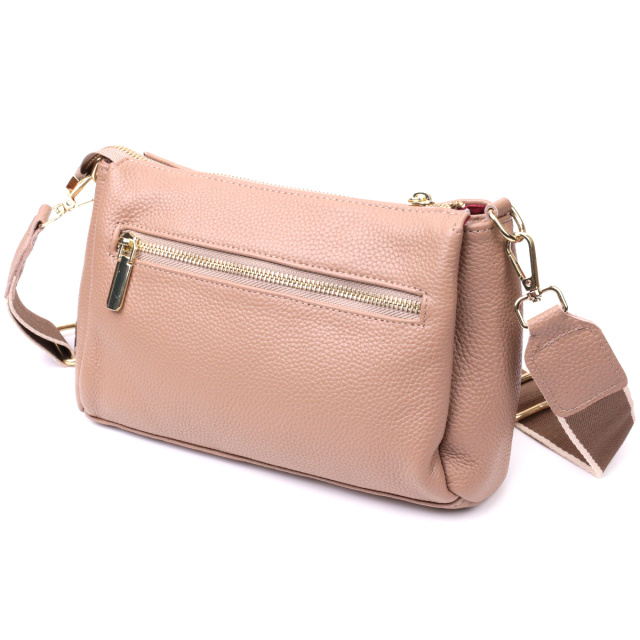 Интересная сумка светло-бежевого цвета с легкой розовинкой из натуральной кожи с высоким показателем качества и износостойкости. Аксессуар состоит из трех основных отделений, потайного кармана на молнии, кармана открытого типа и кармана на молнии снаружи. Носить сумку можно под рукой, на плече и через плечо, для этого имеется текстильный съемный ремень. В изделии использована качественная фурнитура цвета желтого золота. Универсальный вариант сумки как на вечер так и в качестве сумочки на каждый день.