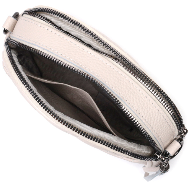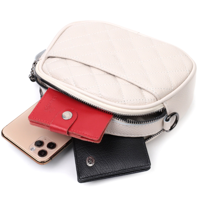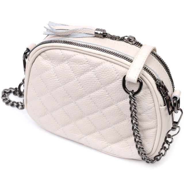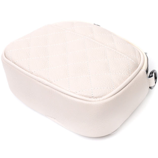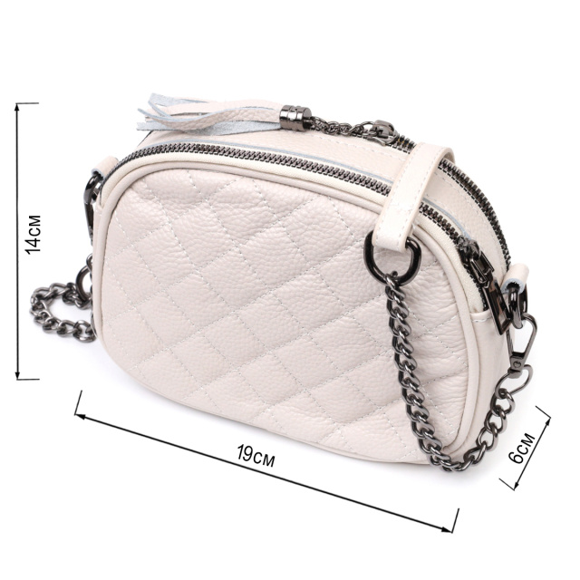 Стильная сумка для женщин небольшого размера на два автономных отделения из натуральной кожи флотар, стеганная модными ромбами. Аксессуар состоит из двух автономных отделений, кармана открытого типа, потайного кармана на молнии и наружного кармана открытого типа. Носить сумку можно в руке, на плече и через плечо, для этого имеется кожаный съемный ремень. В аксессуаре использована качественная фурнитура цвета темного серебра. Отличный вариант сумки для женщин, которые любят качественные и стильные вещи.