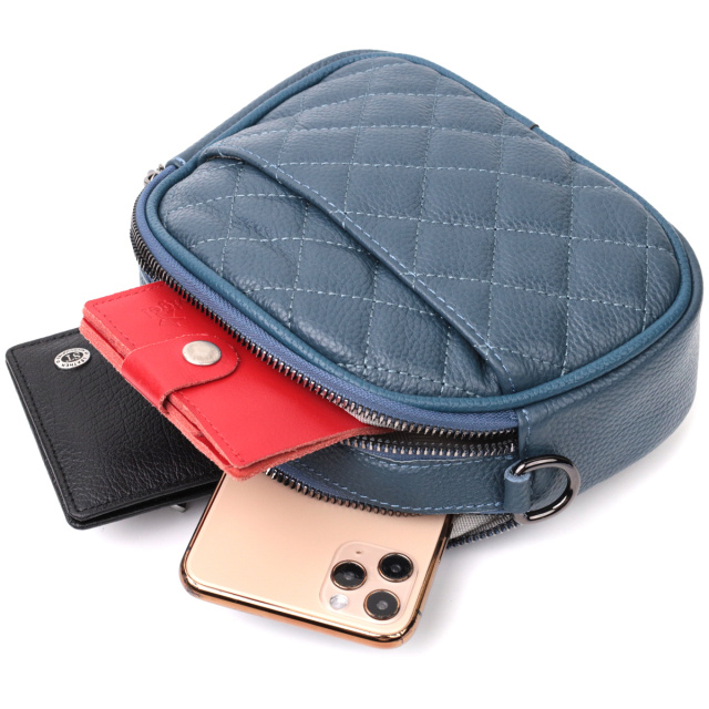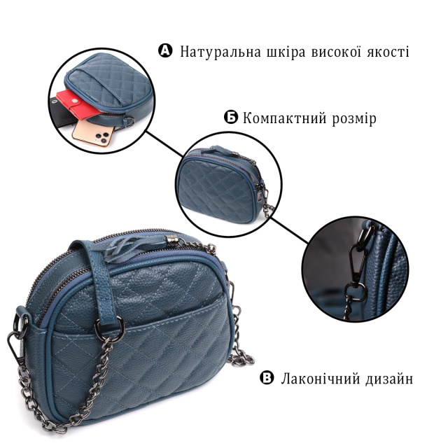 Качественная сумка для женщин небольшого размера на два автономных отделения из натуральной кожи флотар, стеганная модными ромбами. Аксессуар состоит из двух автономных отделений, кармана открытого типа, потайного кармана на молнии и наружного кармана открытого типа. Носить сумку можно в руке, на плече и через плечо, для этого имеется кожаный съемный ремень. В аксессуаре использована качественная фурнитура цвета темного серебра. Отличный вариант сумки для женщин, которые любят качественные и стильные вещи.
