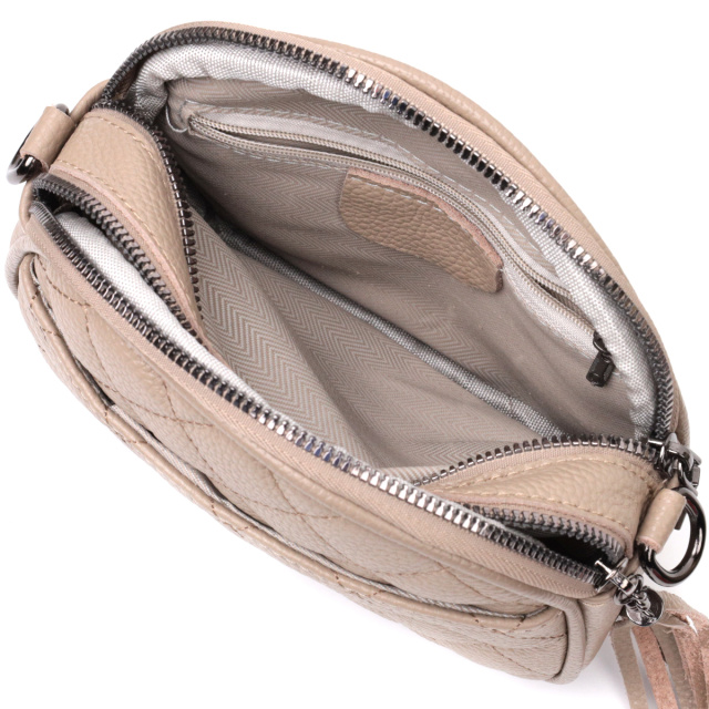 Отменная сумка для женщин небольшого размера на два автономных отделения из натуральной кожи флотар, стеганная модными ромбами. Аксессуар состоит из двух автономных отделений, кармана открытого типа, потайного кармана на молнии и наружного кармана открытого типа. Носить сумку можно в руке, на плече и через плечо, для этого имеется кожаный съемный ремень. В аксессуаре использована качественная фурнитура цвета темного серебра. Отличный вариант сумки для женщин, которые любят качественные и стильные вещи.