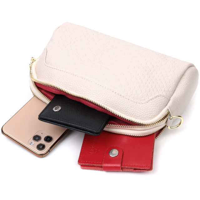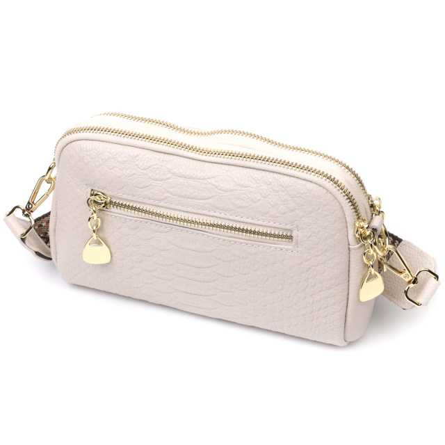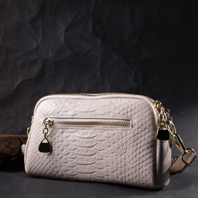 Женская сумка на два автономных отделения из натуральной кожи с тиснением под змею, которая неприхотлива в уходе и долго носится. Аксессуар состоит из двух основных отделений, потайного кармана на молнии, кармана открытого типа и кармана на молнии снаружи. Носить сумку можно в руках, на плече и через плечо, для этого имеется текстильный съемный ремень. В изделии использована качественная фурнитура цвета желтого золота. Универсальный вариант сумки как на вечер так и в качестве сумочки на каждый день.