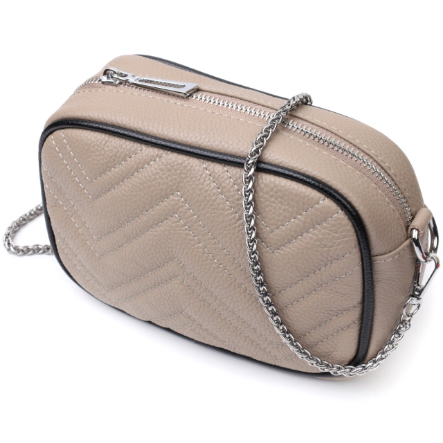 Роскошная женская сумка из натуральной кожи флотар, на лицевой стороне прошита узором в виде треугольников. Аксессуар состоит из одного основного отделения, потайного кармана на молнии, кармана открытого типа и кармана на молнии снаружи. Носить сумку можно на плече и через плечо, для этого имеется съемная цепочка серебряного цвета. Кожаная сумка - лучший подарок для любой девушки.