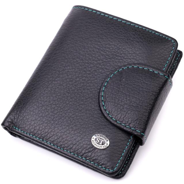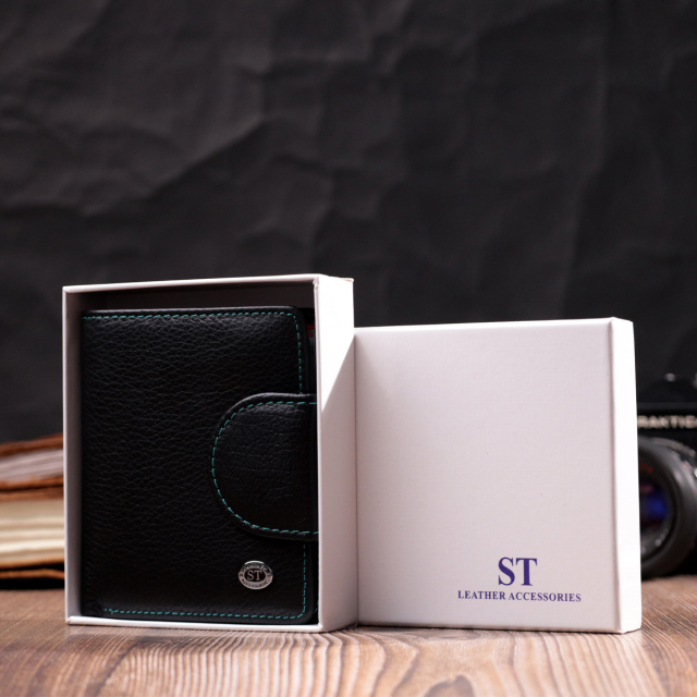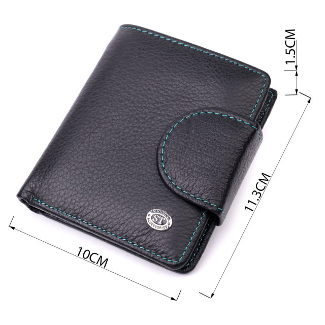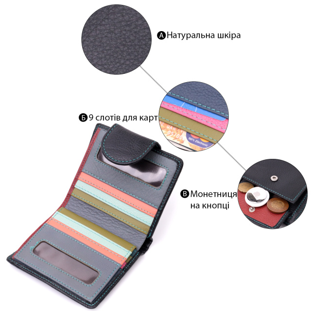 Небольшое вертикальное портмоне в два сложения удобного размера из натуральной кожи высочайшего качества. Кошелек черного цвета снаружи и разноцветный внутри, что очень стильно и современно. Кожаное портмоне очень практичное и служит достаточно долго. Аксессуар состоит из основного отделения с кожаной перегородкой для купюр, кармана на молнии через всю длину, монетницы, девяти ячеек для карт, прозрачного окошка для пропуска и трех скрытых карманов. Портмоне дополнено надежной фурнитурой и прошито по краю ровной строчкой бирюзового цвета. Укомплектован кошелек в фирменную картонную коробку белого цвета. Изделие станет идеальным подарком для девушки любого возраста.