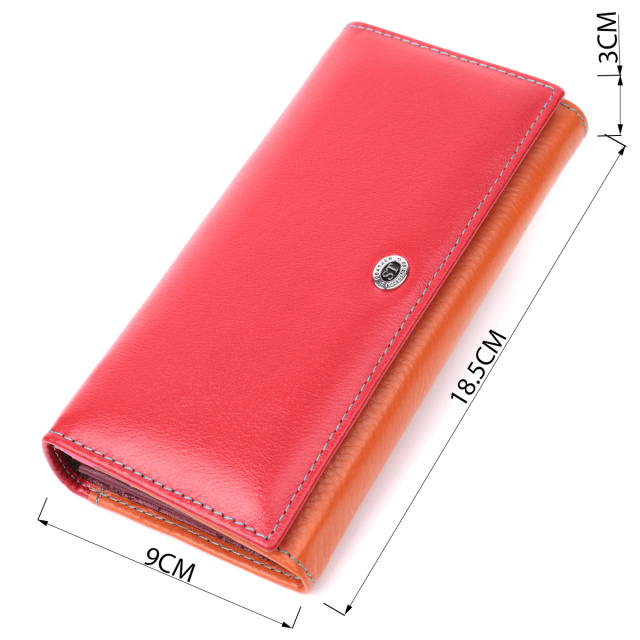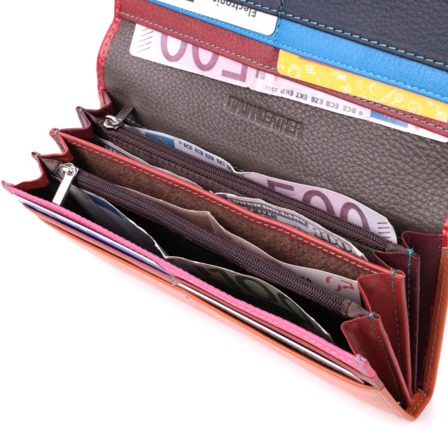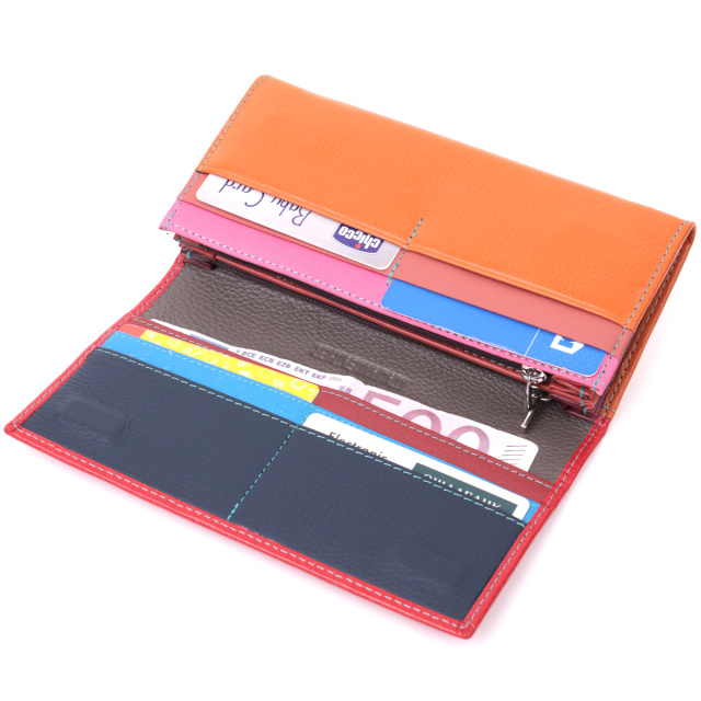Яркое женское портмоне в два сложения из натуральной кожи высочайшего качества. Первое, что бросается в глаза это цветовое решение, вместо однотонного аксессуара мы имеем разноцветный, который содержит два основных наружных цвета и несколько дополнительных внутри. Кожаное портмоне очень практичное и служит достаточно долго. Аксессуар состоит из четырех вместительных карманов для купюр, двух карманов на молниях через всю длину, восьми ячеек для пластиковых карт, скрытого кармана и наружного кармана на молнии, что отлично прослужит для монет. Портмоне дополнено надежной фурнитурой. Укомплектован кошелек в фирменную картонную коробку белого цвета.