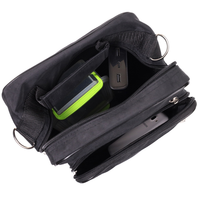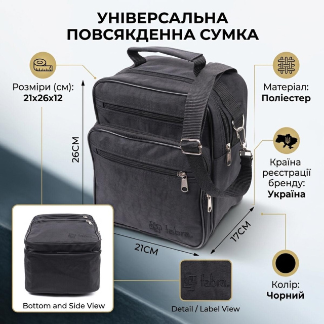 Сумка имеет одно основное отделение, которое закрывается на молнию. На лицевой стороне расположены три кармана на молниях, а на тыльной стороне предусмотрен дополнительный карман на молнии для вещей, которые должны быть под рукой. Такой набор отделений позволяет удобно разместить документы, телефон, кошелек, ключи и другие необходимые мелочи.