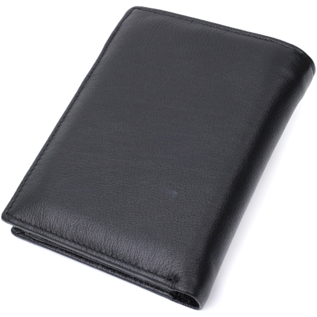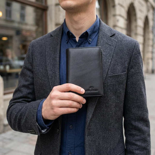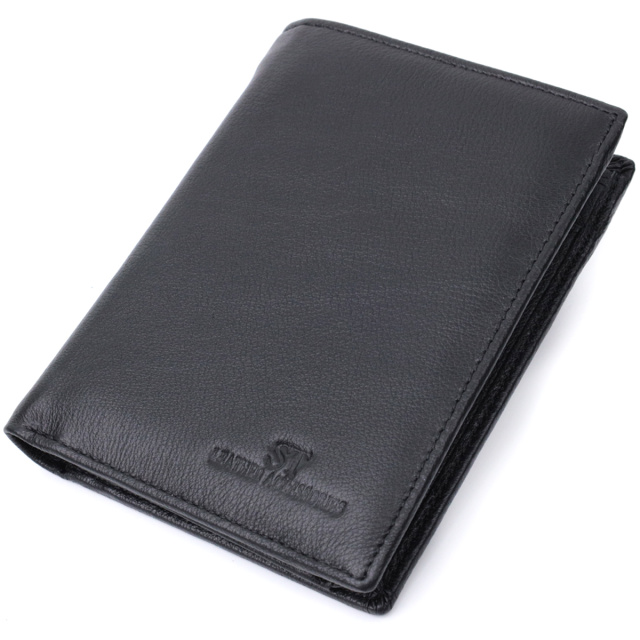 Изделие выполнено из натуральной кожи черного цвета. Материал приятно ощущается в руке, выглядит солидно и хорошо подходит для ежедневного использования. Вертикальный формат делает модель удобной для ношения в сумке, барсетке или внутреннем кармане.