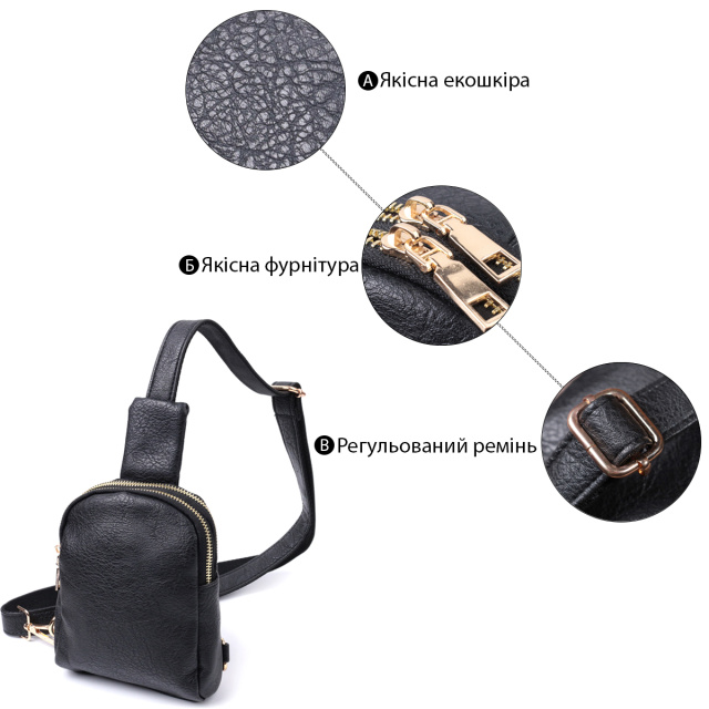 Материал: экокожа; Цвет: черный; Размеры (ШхВхГ, см): 13х18х4см; Страна производитель: Китай. Особенности: - два отделения на молниях; - два