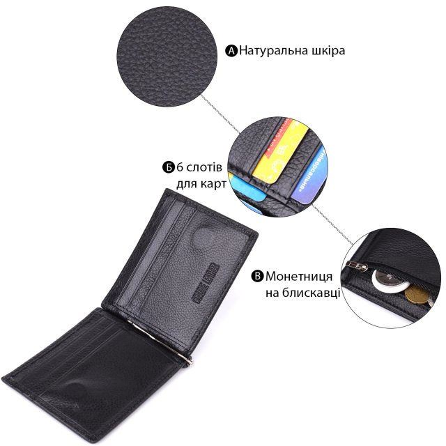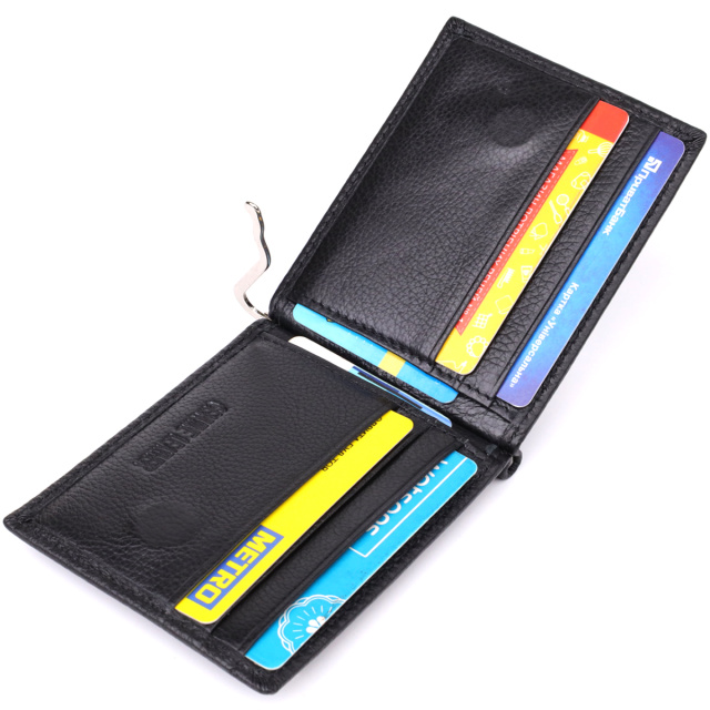 Элегантный и удобный бумажник с зажимом — отличный выбор для деловых мужчин, ценящих качество, функциональность и минимализм. Аксессуар выполнен из натуральной кожи с приятной фактурой и обладает хорошей вместительностью при компактных размерах. Бумажник оснащён прочной подкладкой и надежной фурнитурой, что обеспечивает долговечность и комфорт при ежедневном использовании. В нижнем правом углу лицевой стороны расположен аккуратный металлический логотип производителя — знак подлинности и высокого качества исполнения. Поставляется в фирменной картонной коробке белого цвета, что делает его отличным решением для подарка или стильным аксессуаром для себя.