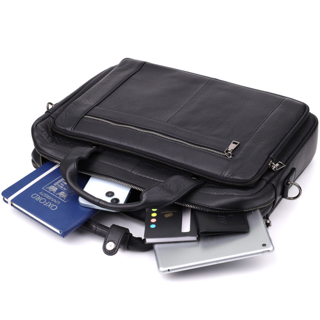 Портфель укомплектован двумя прочными кожаными ручками для переноски в руках и съёмным регулируемым ремешком для ношения на плече. Такой аксессуар станет надежным спутником в поездках, на деловых встречах или в офисной повседневности — всё необходимое всегда под рукой, в одном аккуратном и стильном решении.