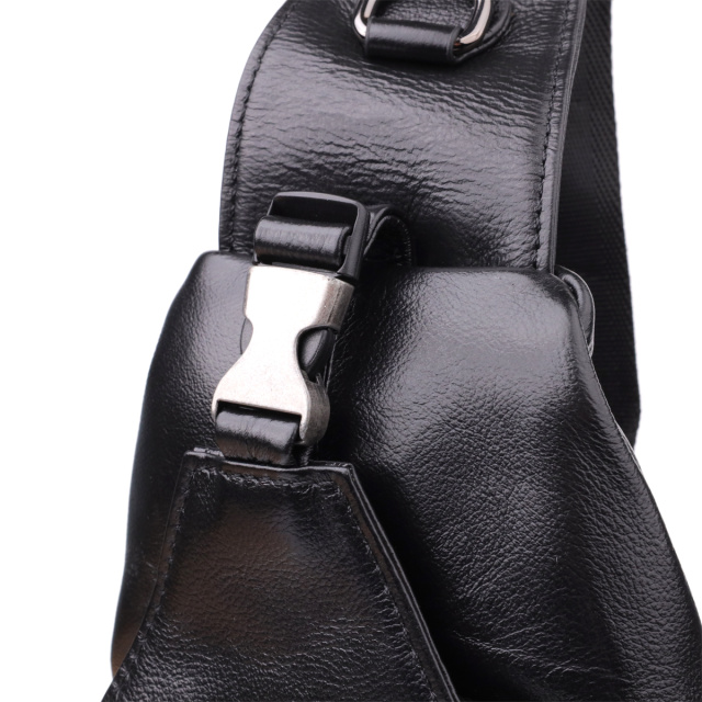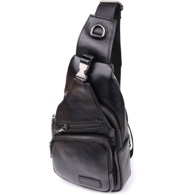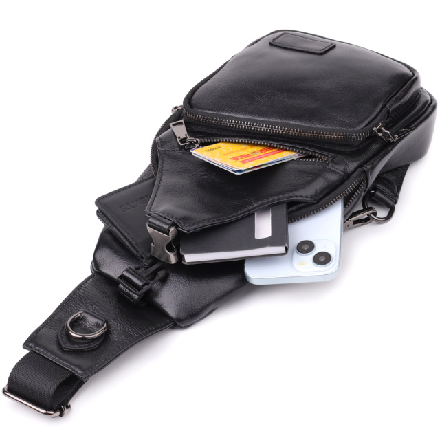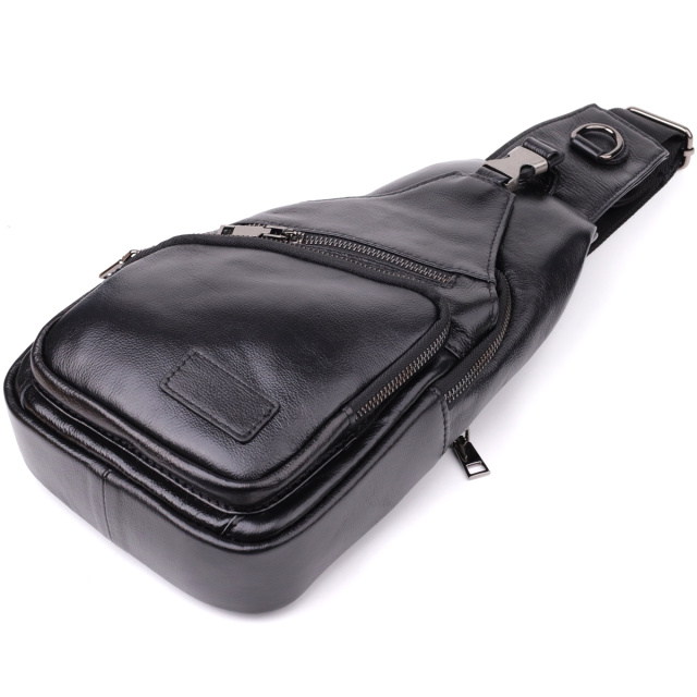 Черная кожаная сумка через плечо сочетает в себе изысканный внешний вид и продуманную функциональность. Одно основное отделение на молнии обеспечивает безопасность и удобство хранения вещей. Внутри расположены два кармана — один на молнии для ценных мелочей и один открытого типа для быстрого доступа.