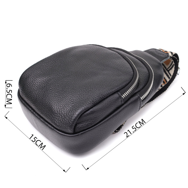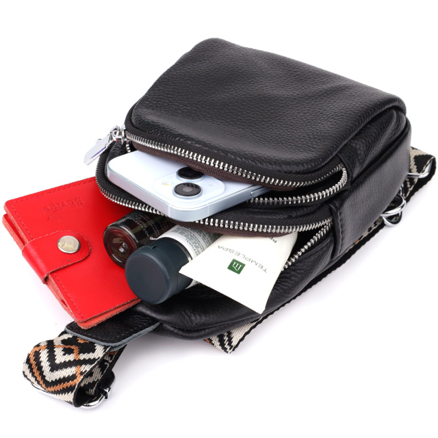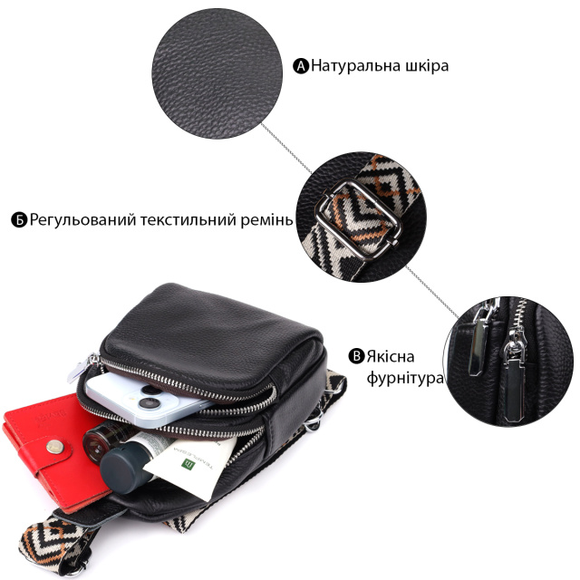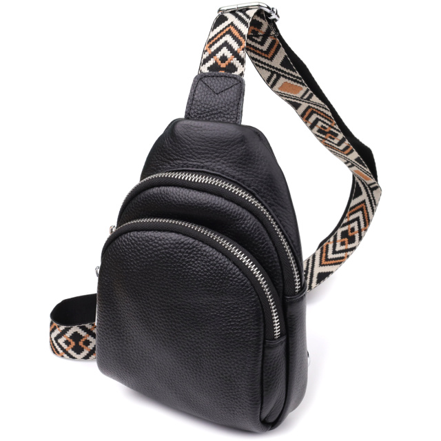Особое внимание заслуживает регулируемый текстильный ремень с ярким стильным узором — он не только обеспечивает комфортную посадку на теле, но и становится выразительным элементом дизайна. Ремень несъёмный, но легко регулируется под ваш рост и способ ношения. Фурнитура выполнена в серебристом цвете, что придаёт аксессуару современный и сдержанный блеск, прекрасно сочетающийся с текстурой кожи и акцентами ремня.