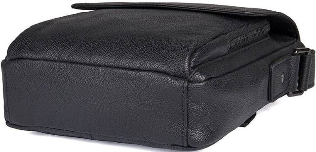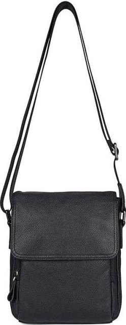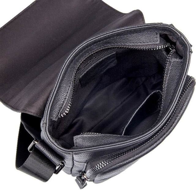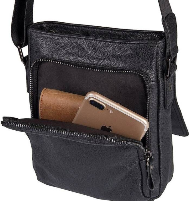 Компактная мужская сумка черного цвета, из натуральной зернистой кожи. Цвет фурнитуры: темное серебро. Аксессуар небольшой, но при этом достаточно вместительный и функциональный.