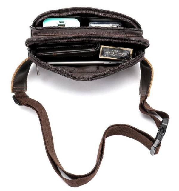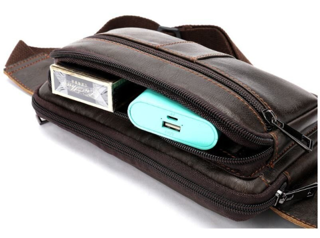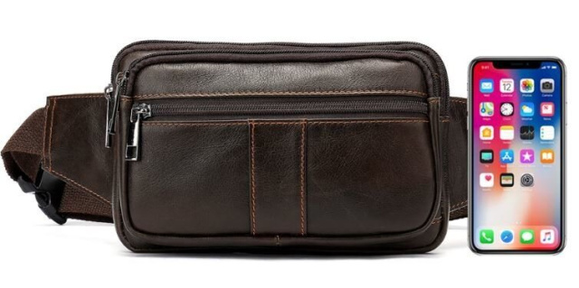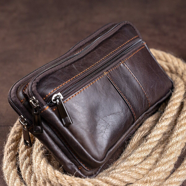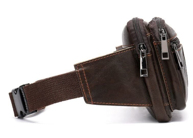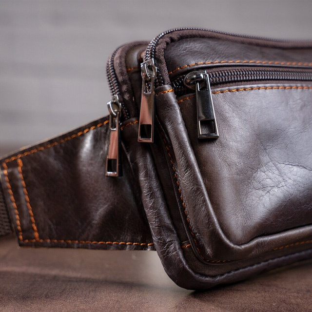 Сумка на пояс с простым, классическим дизайном. Поясные сумки пользуются огромной популярностью среди мужчин. С такой сумкой все самое важное будет у вас всегда под рукой. А украсть сумку с пояса будет намного сложнее. Поэтому с такой бананкой вы будете чувствовать себя безопаснее. Также, с ней удобно ездить в транспорте или брать ее на дальние поездки. Хороший вариант – малогабаритный, но при этом достаточно вместительный. Вам будет легко с такой сумки достать документы или деньги при необходимости. Модель прошита рыжей строчкой и дополнена фурнитурой серебристого цвета. Будет хорошо смотреться в качестве подарка для близкого человека.