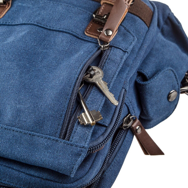 Модель имеет основное отделение на молнии. Внутри предусмотрены открытый накладной карман, два кармана для мобильного телефона и карман на молнии. Под клапаном расположены дополнительное отделение на молнии и открытый накладной карман, а на самом клапане предусмотрен вертикальный карман на молнии. Сбоку находится еще один карман для вещей, которые должны быть под рукой.