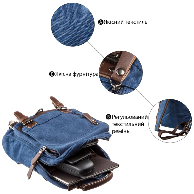 Изделие выполнено из текстиля синего цвета. Материал хорошо подходит для повседневного использования, а подкладка из темной коричневой ткани делает модель более практичной. Такой формат сумки удобен для ношения на одном плече и отлично вписывается в городской стиль.