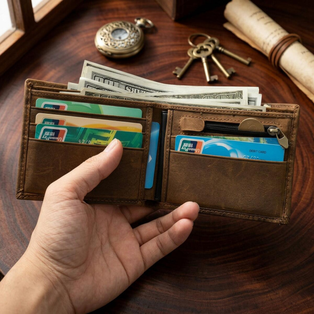 Практичный аксессуар для карт, купюр, монет и документов, который хорошо подходит для ежедневного использования.