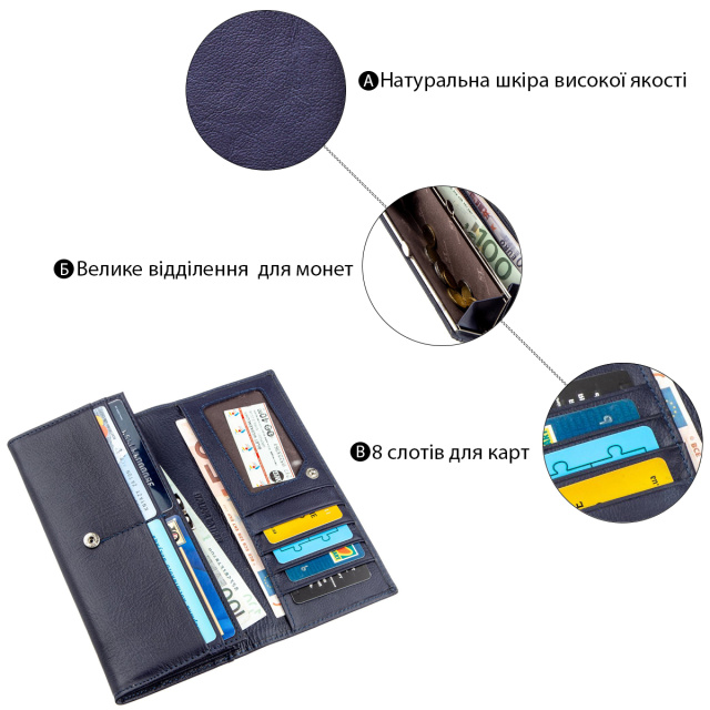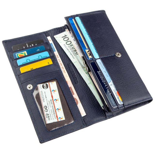 Выразительный кошелек для восхитительных женщин любого возраста и положения. Качественно выполнен из натуральной добротной кожи с зернистой фактурой. Цвет – темно-синий, поэтому подойдет под любой гардероб. Выглядит аксессуар очень стильно и модно. Наполнение кошелька представлено в виде трех основных отделений, отделения на молнии, монетнице на защелке, карманами для карточек и визиток, а также внешним отделением на тыльной стороне изделия. Данный аксессуар станет прекрасным подарком, не только для Вас, но и для близкого человека. Упакован кошелек в фирменную плотную коробку белого цвета.