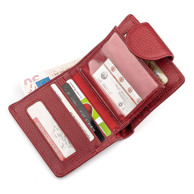 Изделие выполнено из натуральной кожи в ярком красном цвете. Материал приятный на ощупь, выглядит эффектно и хорошо подходит для ежедневного использования. Благодаря компактному размеру кошелек легко помещается даже в небольшую сумку, а подарочная коробка делает его удачным вариантом подарка.