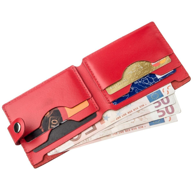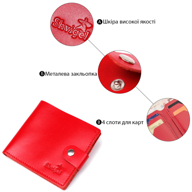 Компактный кошелек маленького размера. Модель тоненькая и легко поместится даже в самую маленькую сумочку. Аксессуар не займет много места и не имеет лишнего веса. Закрывается кошелек хлястиком с кнопкой. Внутри изделие изготовлено также из натуральной кожи. По краям аксессуара ровная красная строчка. На лицевой стороне кошелек украшен тисненым логотипом Shvigel. Плотная кожа прослужит вам очень долго. Яркий, красный цвет понравится любой моднице.