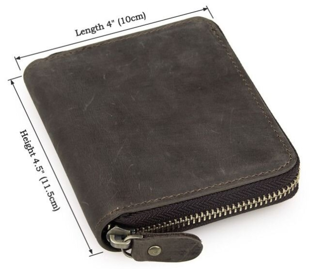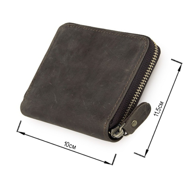 Великолепный кошелек из высококачественной винтажной кожи. Бумажник имеет весьма компактные размеры, но не смотря на это он достаточно вместителен и функционален. Аксессуар закрывается на молнию. Цвет фурнитуры: латунь. Данный купюрник может использоваться как мужчинами, так и женщинами. Кошелек упакован в текстильный пылезащитный чехол.